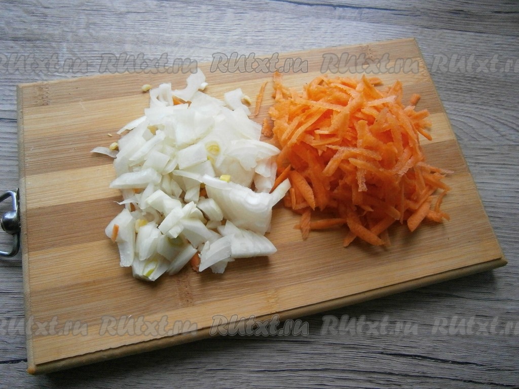 Лук нарезать произвольно, морковь натереть на крупной терке.