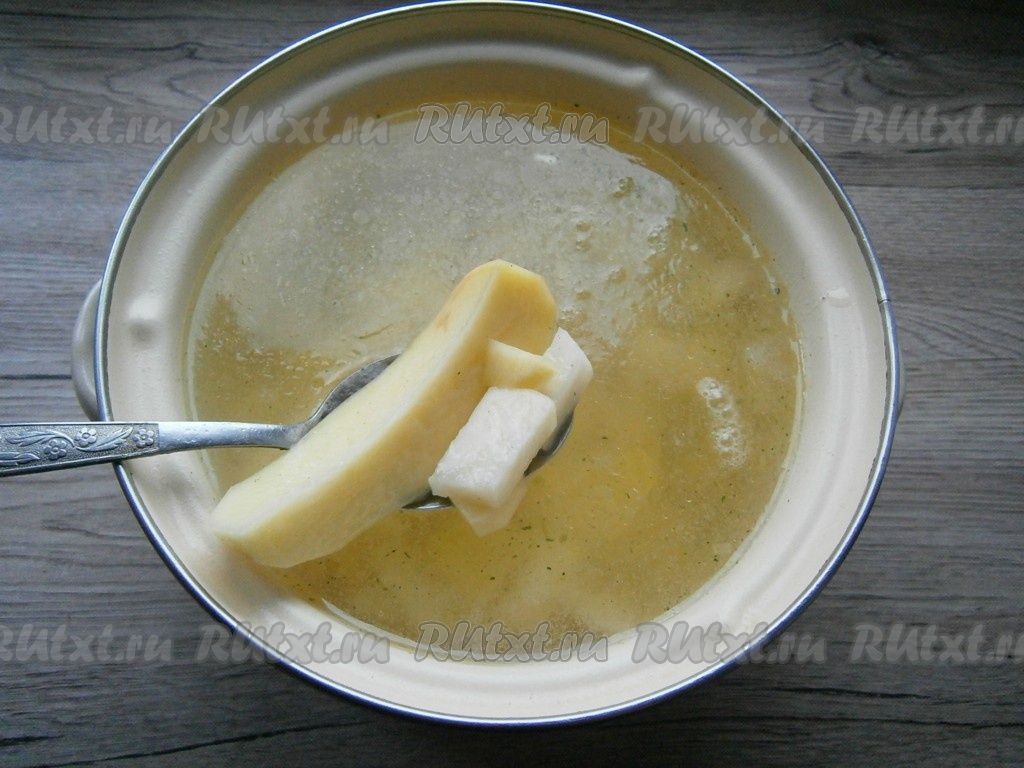 В кастрюлю налить бульон, довести его до кипения. Выложить в бульон весь картофель, посолить по вкусу, варить картошку 25-30 минут (до готовности) на медленном огне.