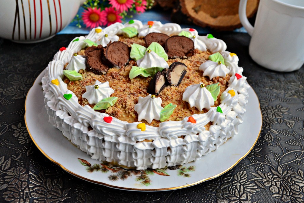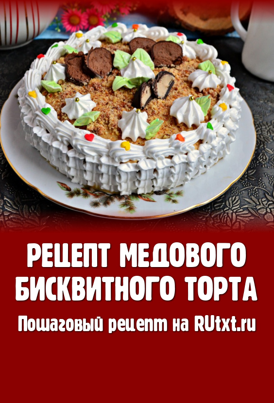 Поместить тортик в холодильник на 3-4 часа, после чего его украсить. Я украсила белковым кремом "мокрое безе", кусочками шоколадных конфет и цветной посыпкой. Для приготовления "мокрого безе": к 2 сырым яичным белкам добавить 0,5 стакана сахара, 0,5 пакетика ванильного сахара и 1 грамм лимонной кислоты, взбить немного миксером. Далее миску с этой смесью поместить на водяную баню на минимальный огонь и взбивать миксером сначала на средней, а потом на высокой скорости до тех пор, пока крем не станет пышным, плотным, с хорошо устойчивыми пиками (для этого понадобится 8-10 минут). Затем крем снять с водяной бани, продолжая взбивать еще пару минут, после чего его остудить и можно украшать торт. Простой, но безумно вкусный медовый бисквитный торт готов, можно подавать к столу!