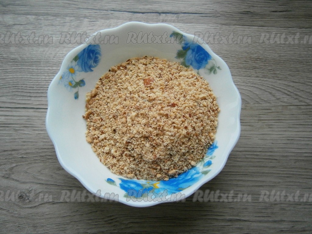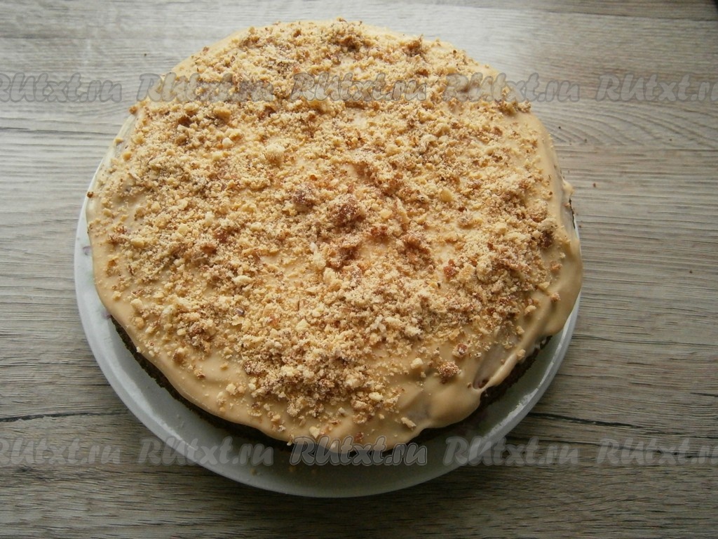 Смазанную кремом часть бисквита накрыть второй частью, смазать также масляным кремом и щедро посыпать сверху измельченным миндалем.