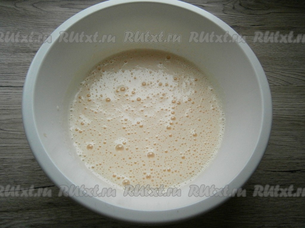Миксером взбить яйца с сахаром и мёдом до пышной светлой массы. Взбивать нужно не менее 10 минут, чтобы весь сахар растворился.