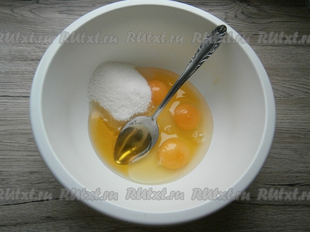 В глубокую миску разбить 3 яйца, добавить сахар, ванильный сахар и жидкий мед.