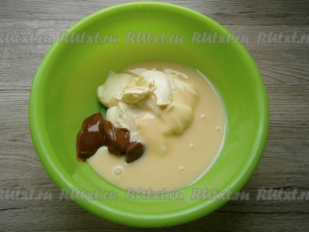 Бисквит получается достаточно плотным, поэтому его обязательно нужно пропитать сахарным сиропом. Для приготовления сиропа воду с сахаром довести до кипения, всыпать лимонную кислоту. Варить сироп на медленном огне минуты 3-4, после чего убрать с огня, полностью остудить, а затем пропитать коржи. Приготовить масляный крем для прослойки торта: к размягченному сливочному маслу добавить обычную сгущенку и сгущенку вареную.