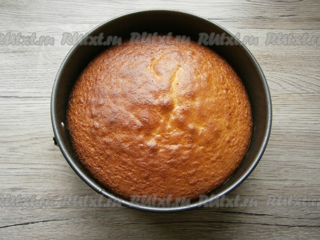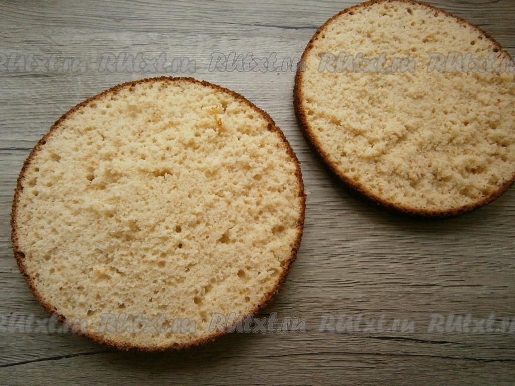 Бисквит аккуратно извлечь из формы, если появилась выпуклость сверху - срезать ее. Бисквит полностью остудить и разрезать на 2 части.
