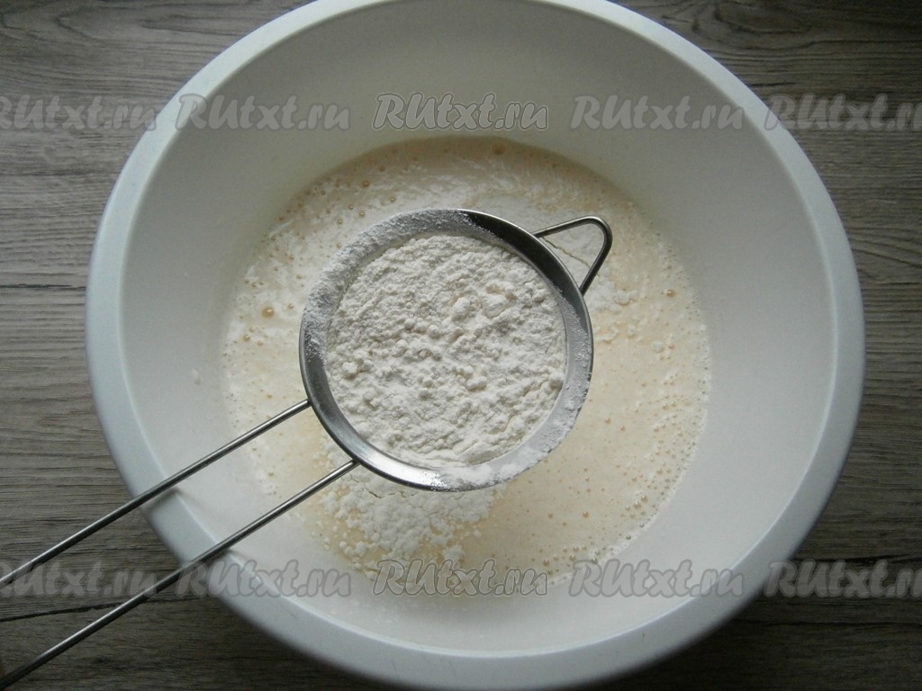 В два приема всыпать просеянную муку, каждый раз ее аккуратно и тщательно вмешивая с помощью ложки или лопатки в яичную массу.