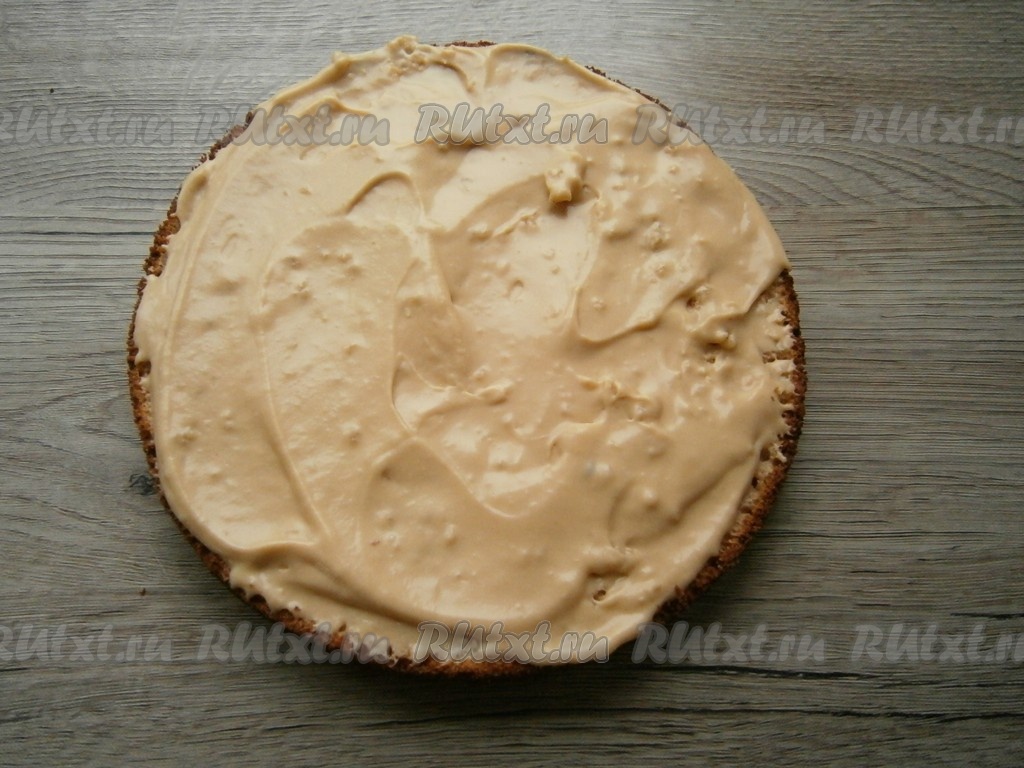 Нижнюю часть бисквита щедро смазать масляным кремом.