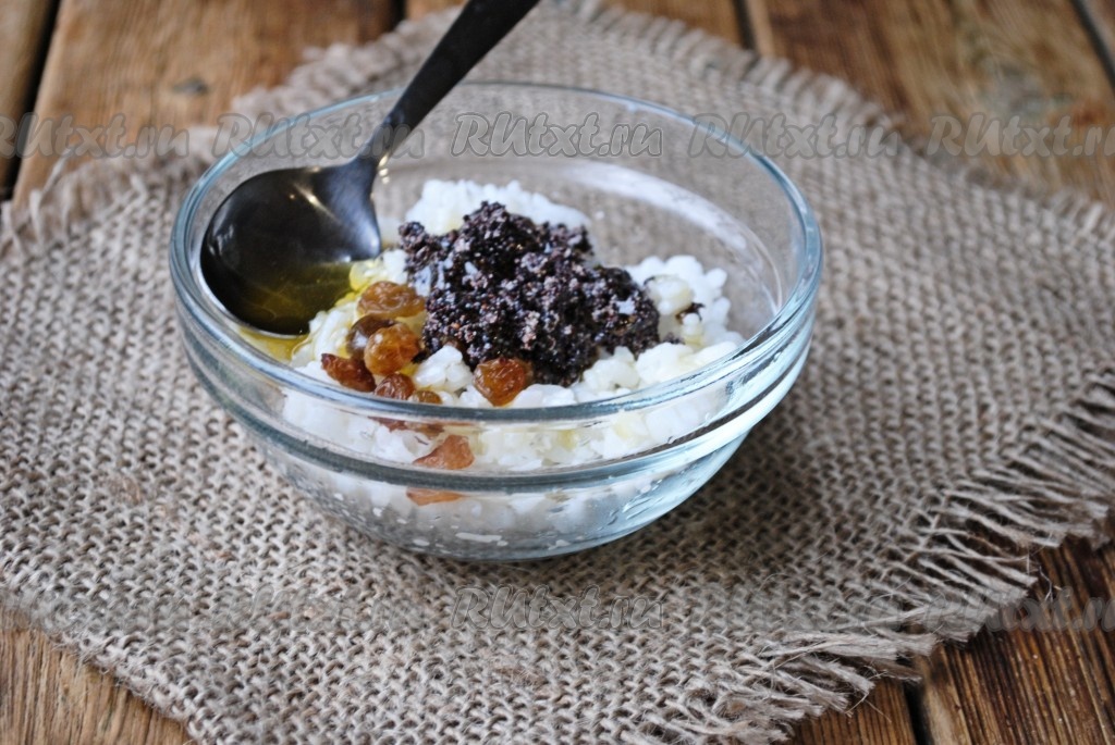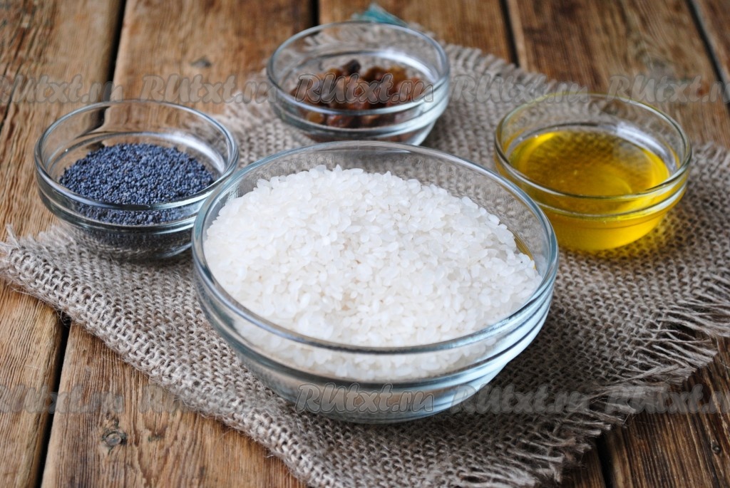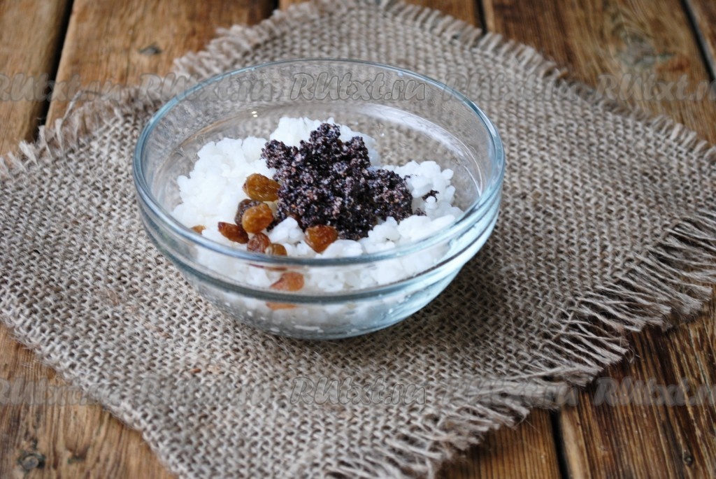В остывший рис добавить изюм и мак.