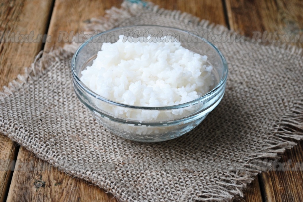 Выложить рис в кастрюлю, залить 325 мл чистой холодной воды, поставить на огонь и довести до кипения. Перемешать, накрыть крышкой и, уменьшив огонь до минимального, варить 10 минут (не снимая крышку и не перемешивая). Затем сделать огонь максимальным и секунд через 10 убрать кастрюлю с огня. Дать рису настояться минут 5. Сваренный рис откинуть на дуршлаг и промыть холодной кипяченой водой.