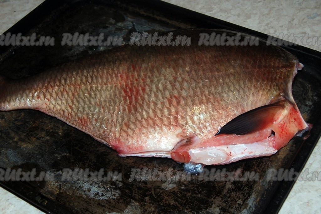 Отрезать плавники, голову, выпотрошить внутренности. Вытащить жабры и глаза из головы. Голову леща промыть и убрать в морозилку, пригодится для рыбных бульонов.