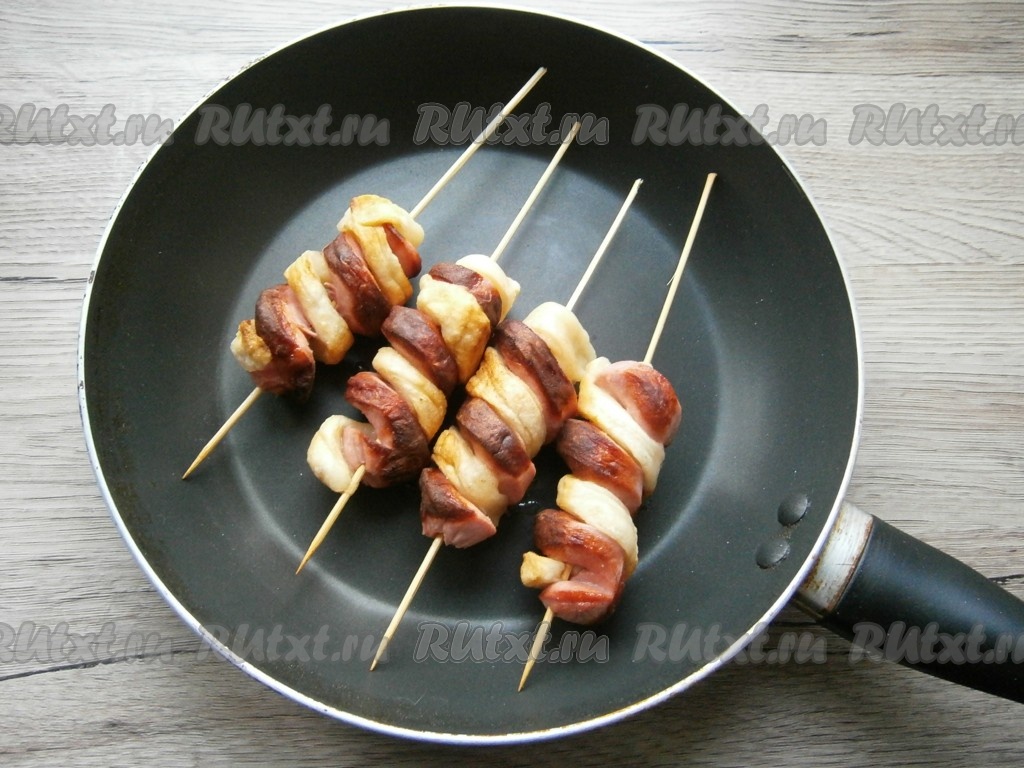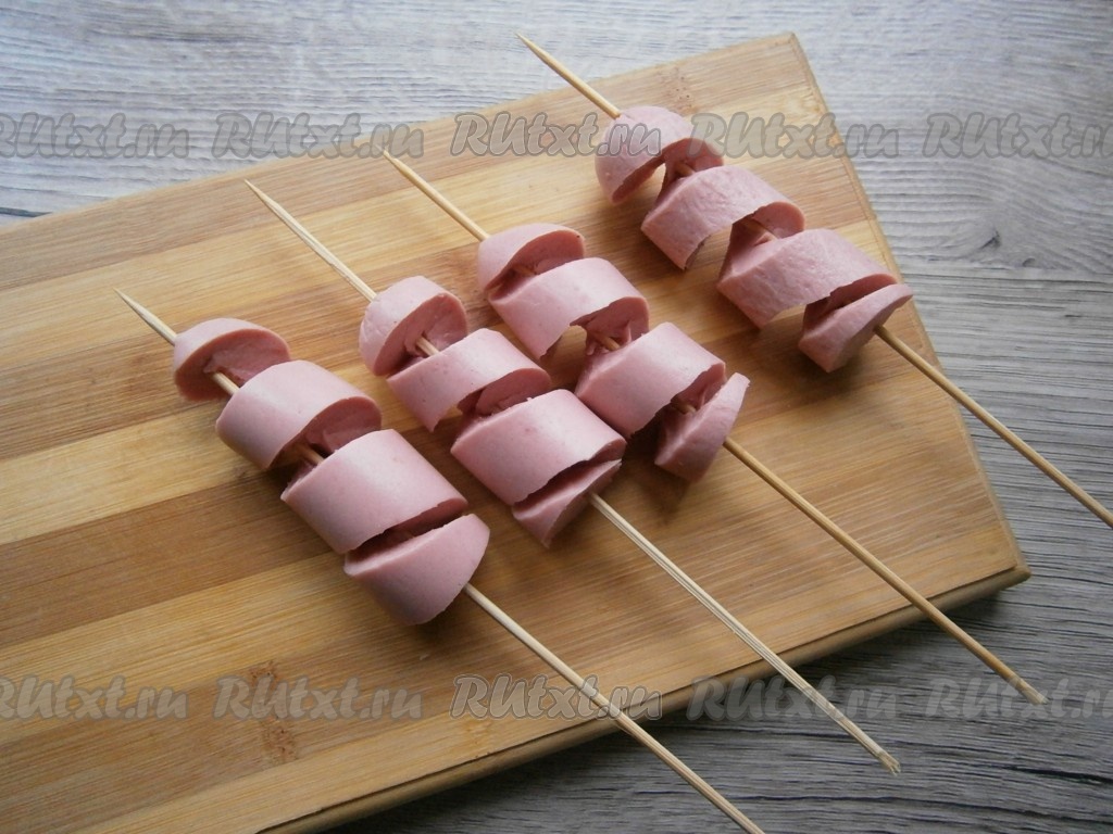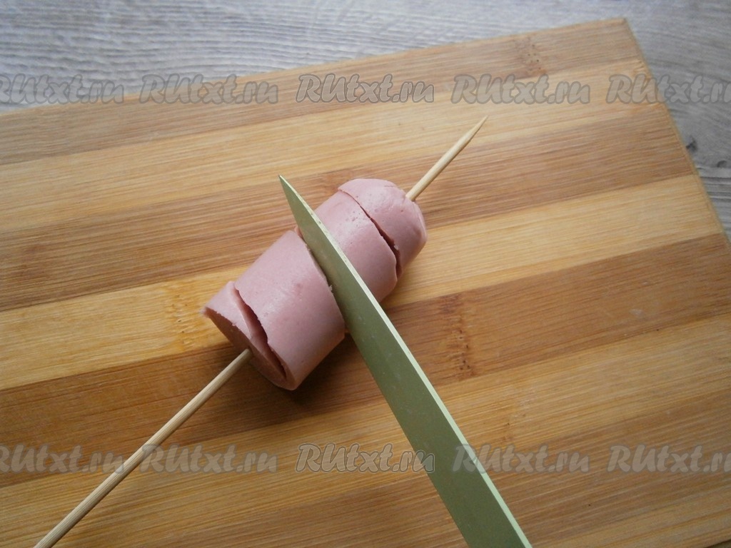 Каждую часть сосиски надеть на шпажку и острым ножом разрезать по спирали, поворачивая шпажку.