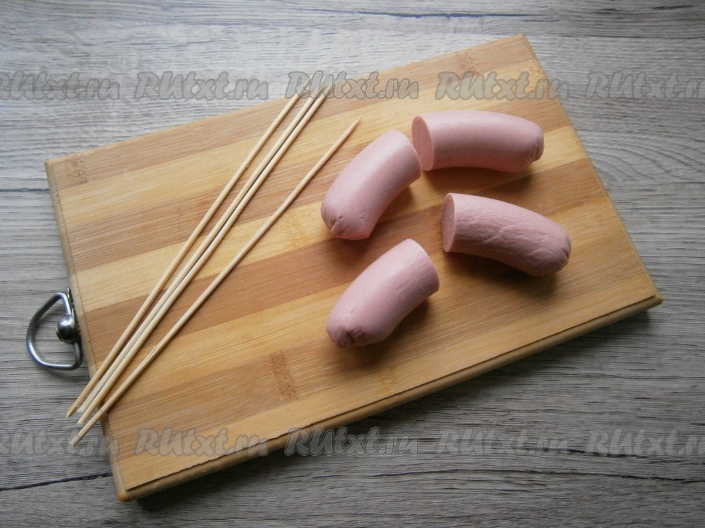 Сосиски спиралькой на шпажках с тестом - это оригинальный фаст-фуд, который несложно приготовить в домашних условиях. Такие сосиски отлично подать с острым соусом к пиву или предложить их для перекуса. Сосиски нужно выбирать только высшего качества. Жарить этот фаст-фуд нужно в достаточном количестве растительного масла, а лучше всего - во фритюре. Расчет продуктов дан на 1 порцию.