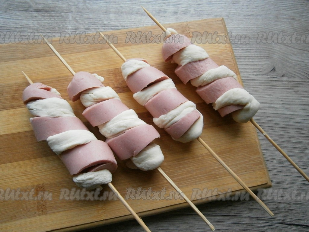 Каждую часть теста скатать в жгутик и обмотать им по разрезам каждую сосиску.