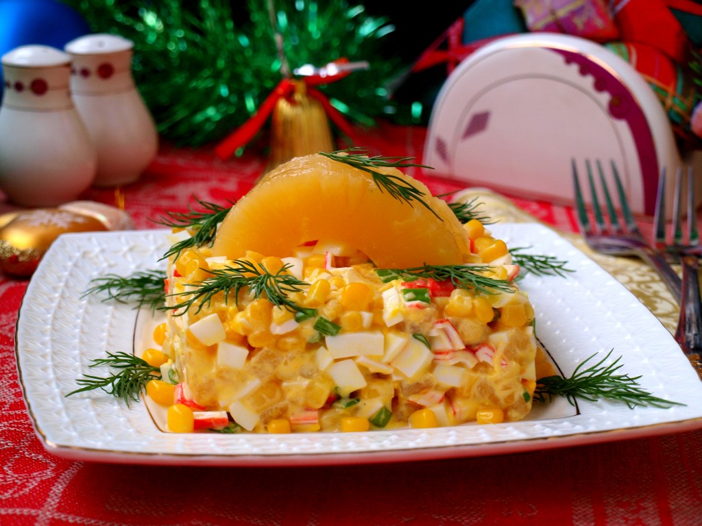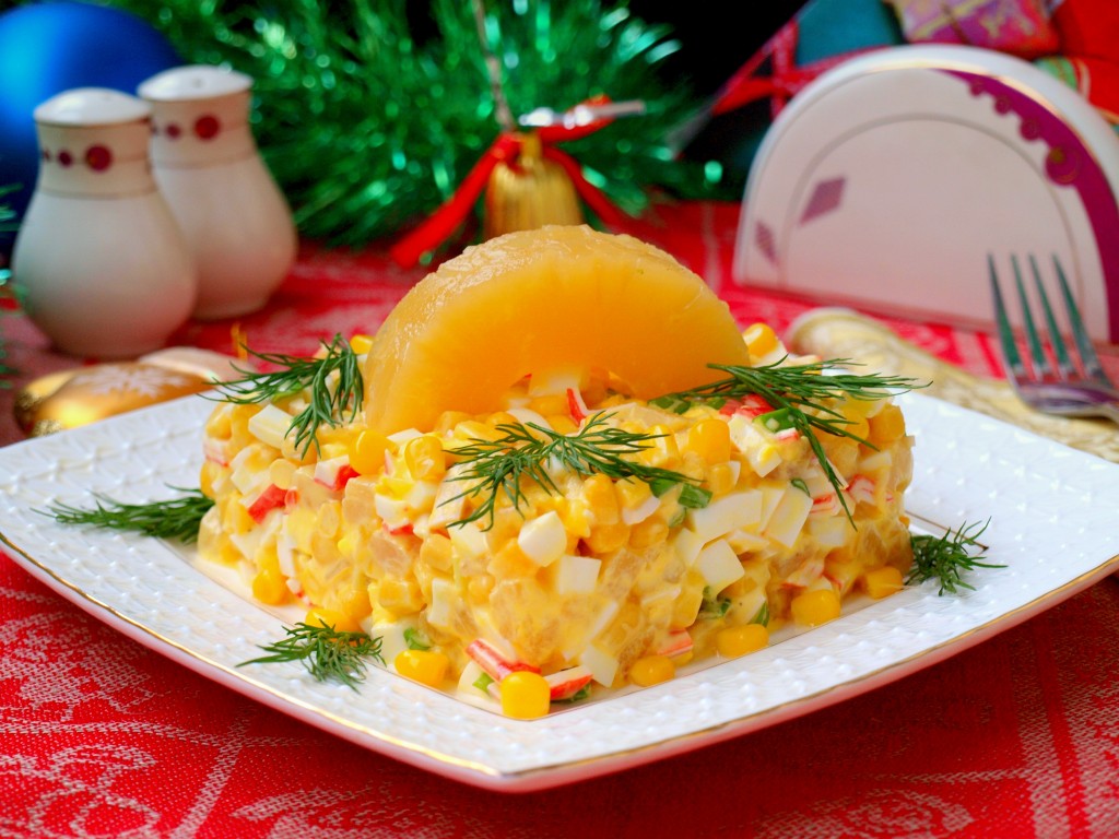 Перед подачей форму снять и подать яркий, сочный, вкусный салат с крабовыми палочками, ананасами и кукурузой к праздничному столу, украсив его кусочком ананаса и зеленью.