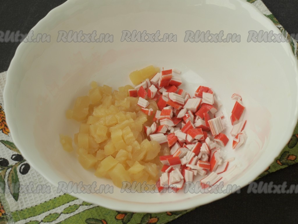 Нарезать кубиками консервированные ананасы и крабовые палочки.