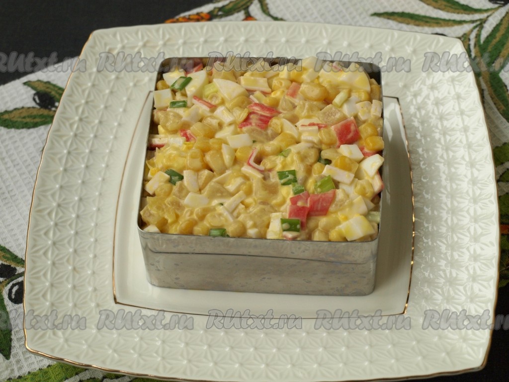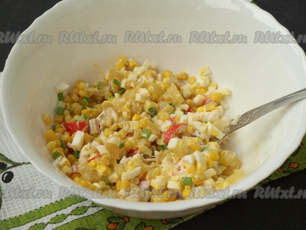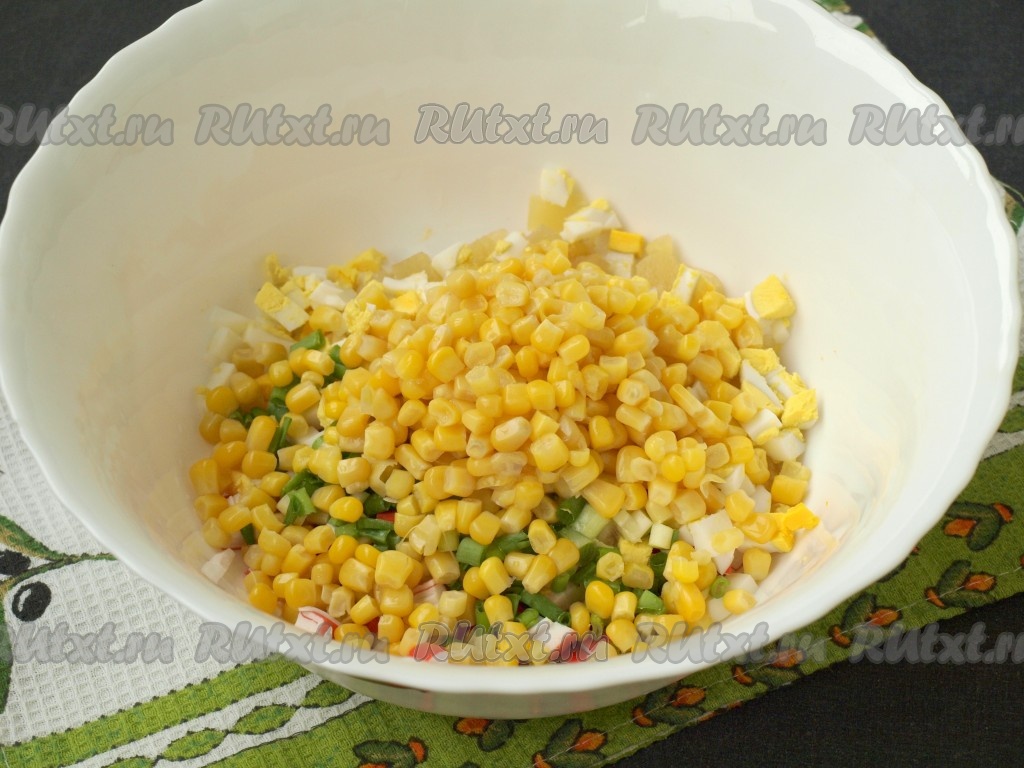 Добавить в салат несколько столовых ложек консервированной кукурузы.