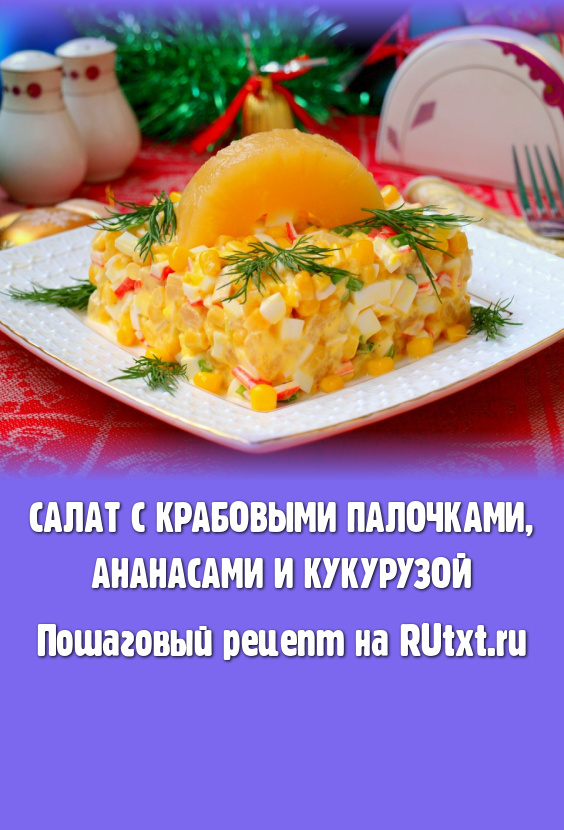 В праздничные дни я всегда готовлю салат с крабовыми палочками, ананасами и кукурузой. Вкус этого салатика очень приятный, освежающий - он нравится и моим домашним, и гостям. Кроме яиц, для этого салата ничего не нужно предварительно отваривать, главное - все продукты приобрести заранее.
