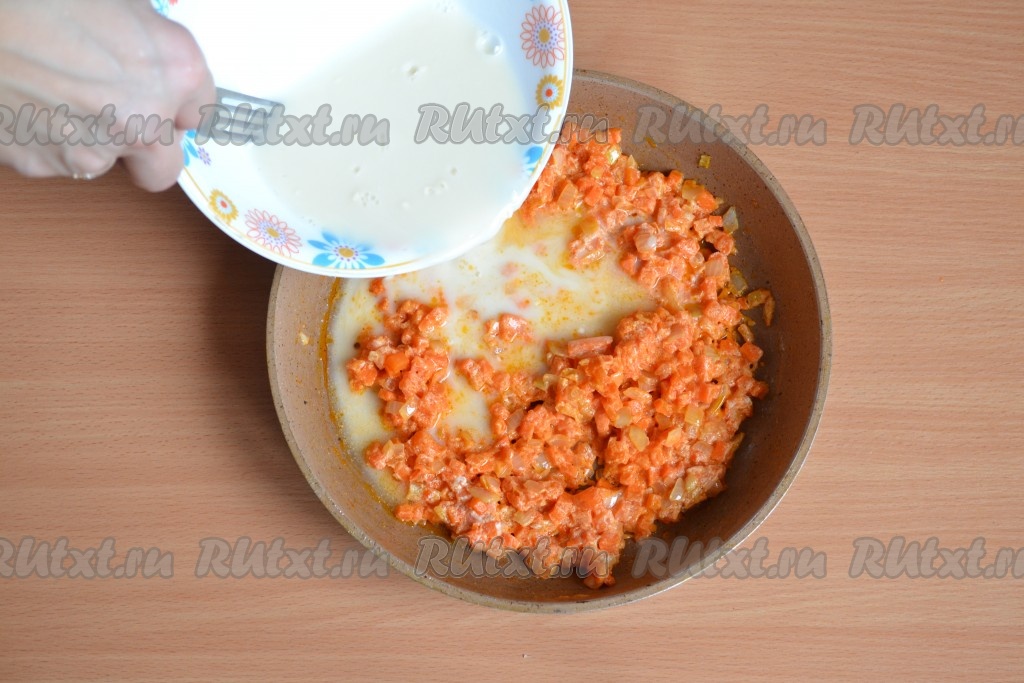 Сразу же влить приготовленную мучную смесь в сковороду и перемешать.