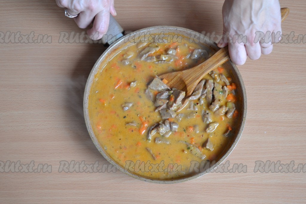 Выложить мясо к соусу. По вкусу всыпать соль.