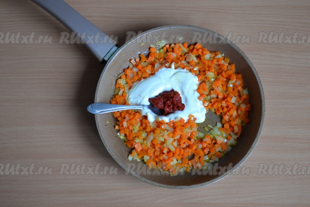 К обжаренным овощам выложить сметану и томатную пасту, перемешать и по вкусу всыпать специи.