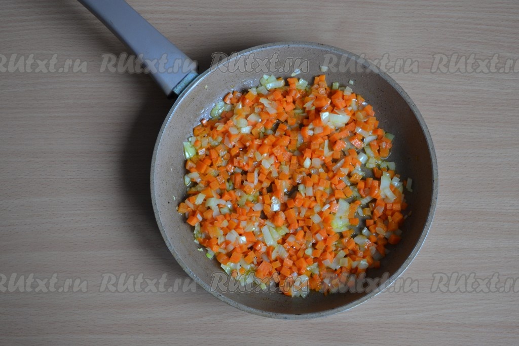 Лук и морковь очистить, нарезать мелкими кубиками. В сковороду налить 1 столовую ложку растительного масла и выложить лук с морковью, помешивая, обжаривать на среднем огне 2-3 минуты (до прозрачности лука).