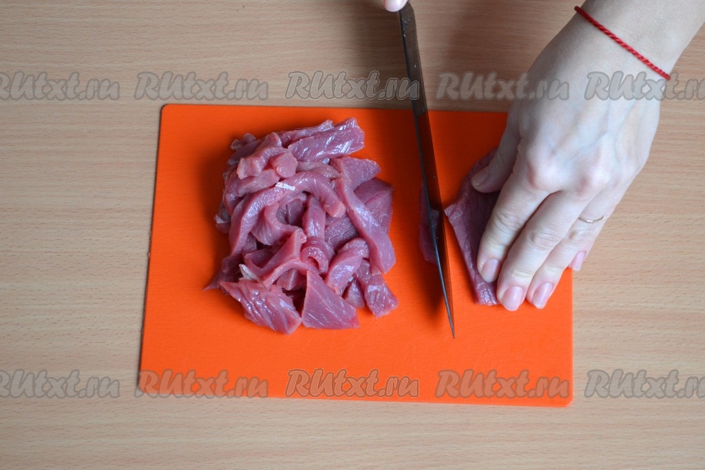 Говядину зачистить от пленок и сухожилий, нарезать тонкими полосками.