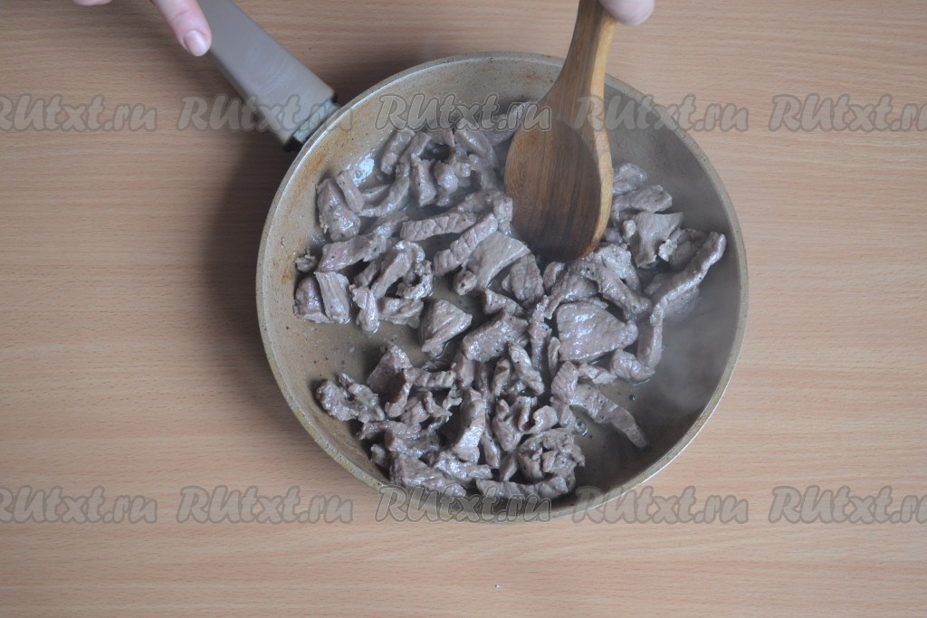 Обжаривать мясо на сильном огне, периодически помешивая, в течение 5-7 минут. Огонь снижать не нужно, иначе говядина выделит много сока и станет жесткой. Обжаренное мясо убрать со сковороды.