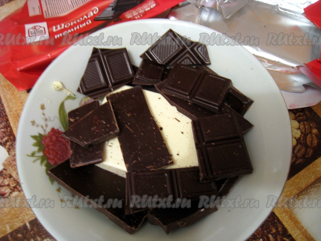 Сначала нужно растопить шоколад, для этого в миску (или в кастрюльку) положить масло и поломанный на кусочки шоколад.