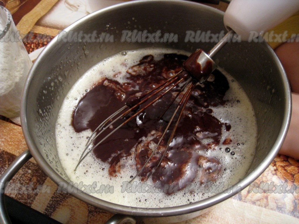 Если расплавлять шоколад и масло в микроволновке, то лучше выбрать пониженную мощность (500-600 Вт) и растапливать 2-3 минуты. Если будете растапливать масло с шоколадом на плите, то лучше делать это на слабом огне, постоянно помешивая. В процессе растапливания не доводите массу до кипения. Дать растопленной шоколадно-масляной массе немного остыть.