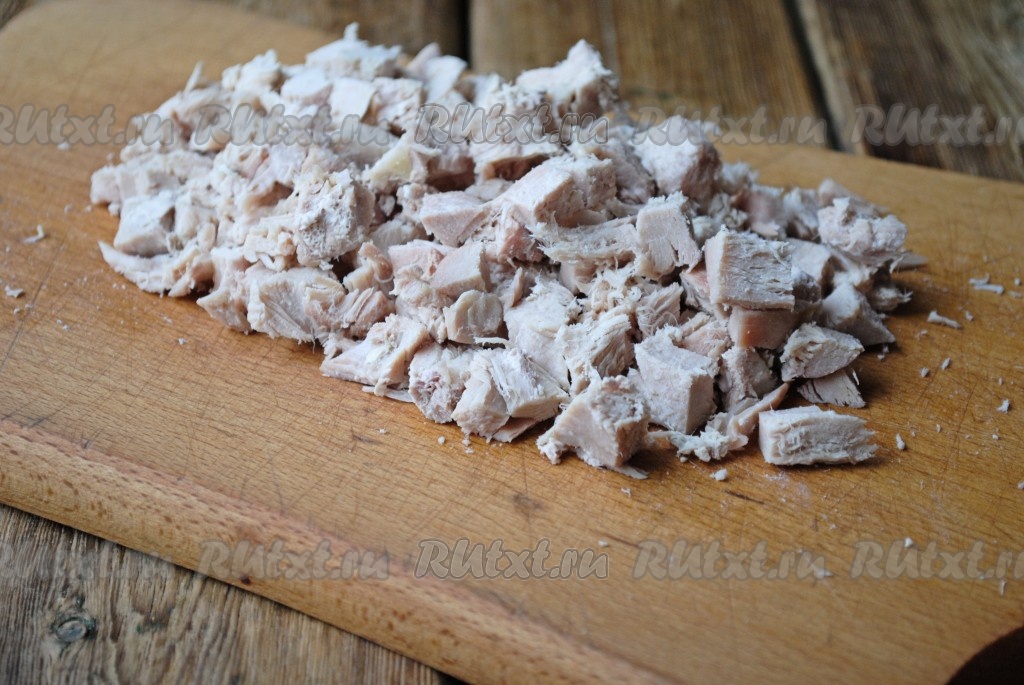 Филе индейки отварить в подсоленной воде до готовности. Я варила индейку 45 минут, время варки будет зависеть от возраста птицы. Готовое мясо должно легко прокалываться ножом. Вареное мясо остудить и нарезать небольшими кусочками.
