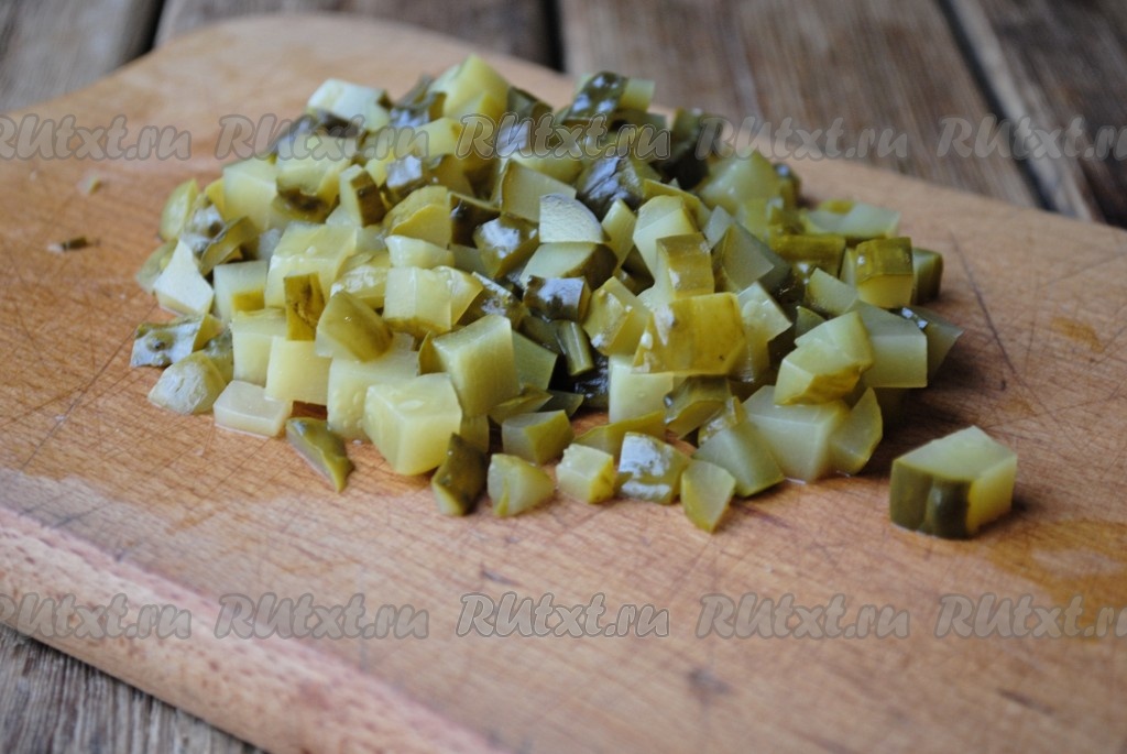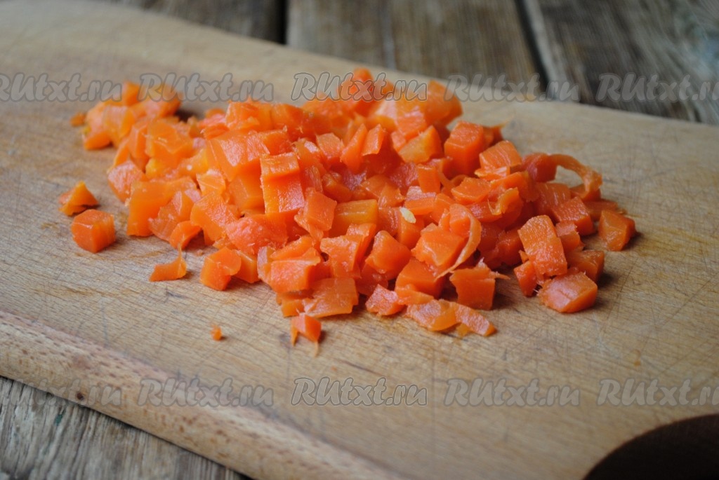 Картофель и морковку вымыть и отварить в подсоленной воде до готовности (готовые овощи легко можно проколоть ножом или вилкой), затем остудить и очистить. Картофель нарезать мелкими кубиками.