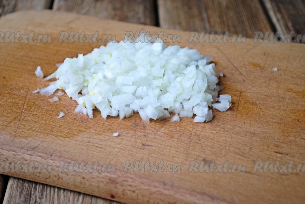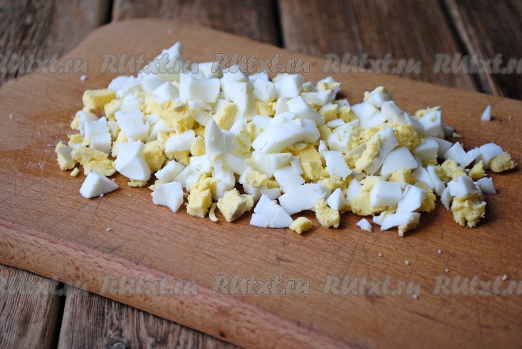 Яйца отварить вкрутую, остудить, очистить и мелко нарезать.