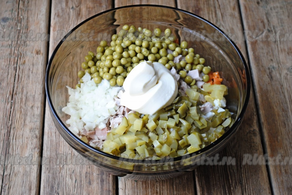 В большую миску сложить картофель, морковь, яйца, консервированный горошек, лук, индейку и огурцы.