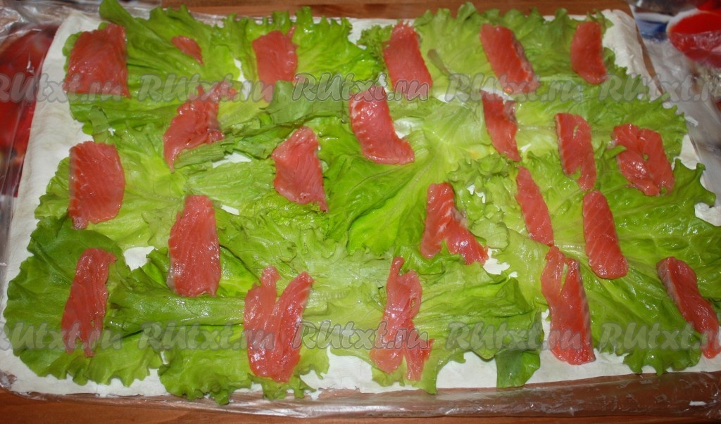 Рыбу нарезать тонкими пластинами и выложить на листья салата.