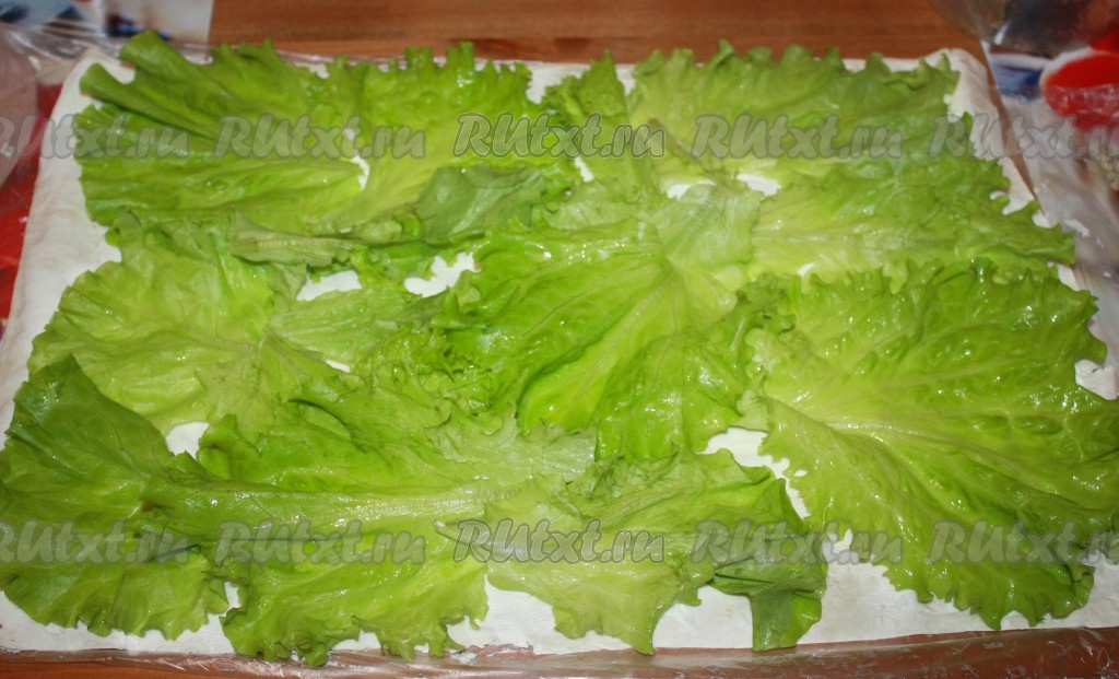 Листья салата предварительно вымыть, просушить. Выложить сверху на творожный сыр.