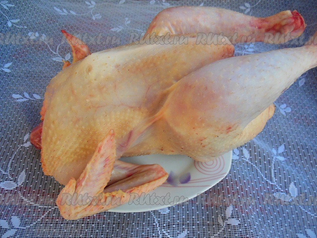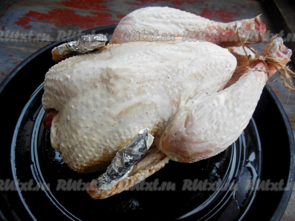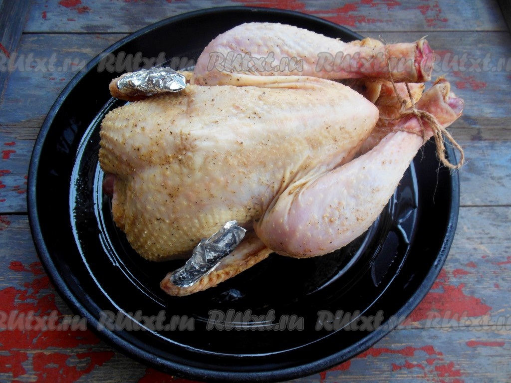 На противень, смазанный растительным маслом, выложите тушку курицы спинкой вниз. Перевяжите ножки курицы шпагатом, оберните кончики крыльев и ножек фольгой.