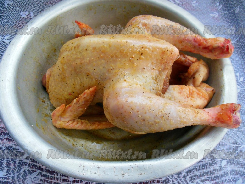 Натрите курицу снаружи и внутри медом, горчицей, солью и черным молотым перцем. Уберите в холодильник на 3 часа (я оставляю на ночь).