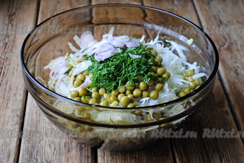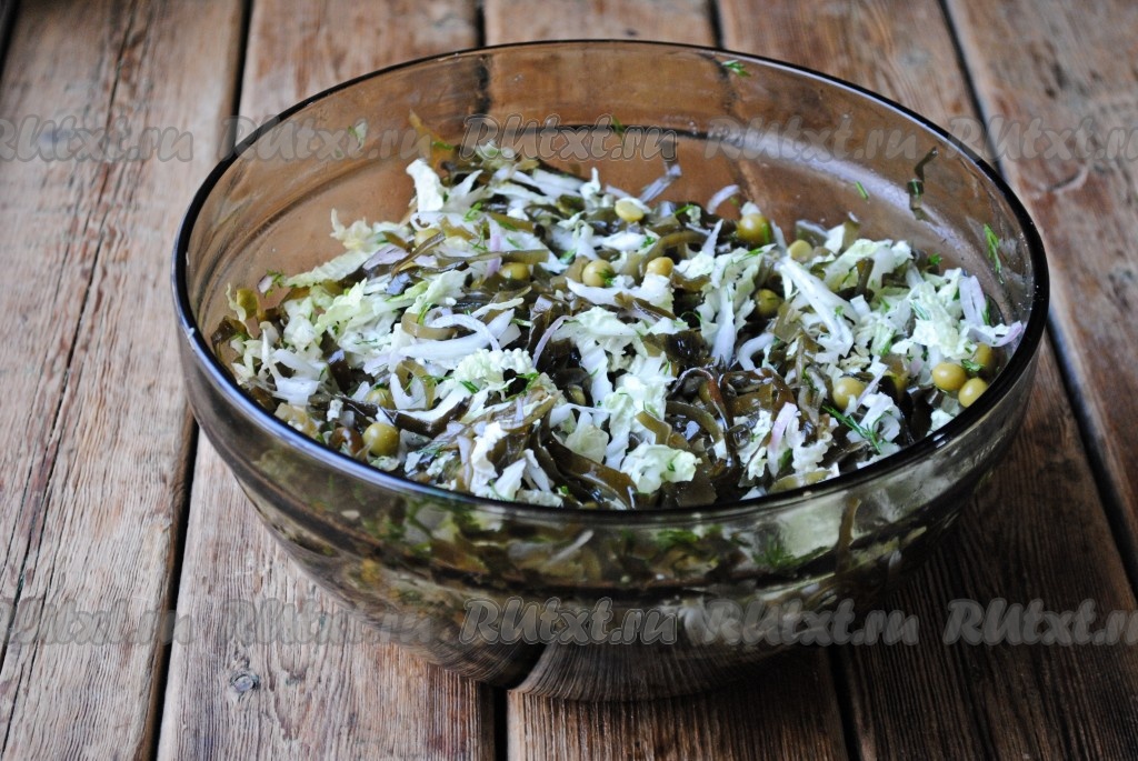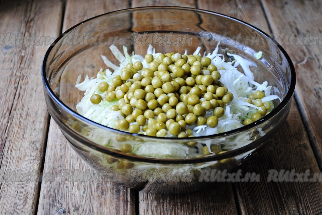 С консервированного горошка слить жидкость (она нам не понадобится), добавить горошек в салат из пекинской капусты и морской капусты.