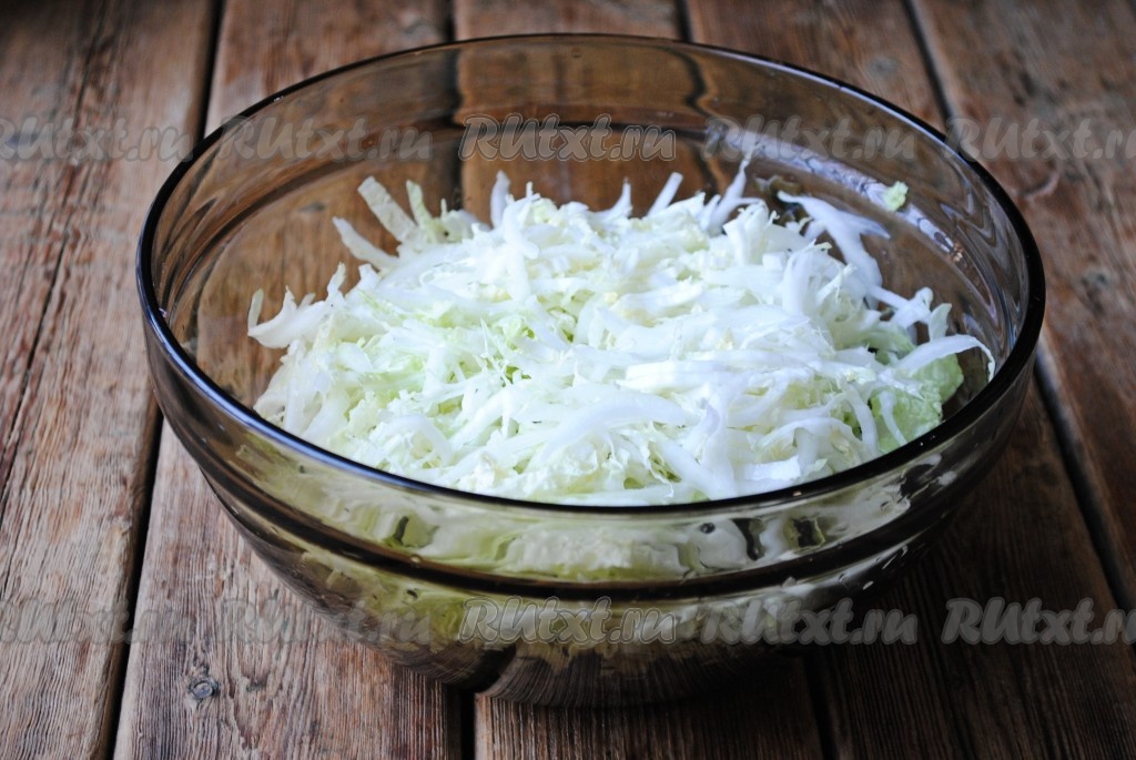 Пекинскую капусту мелко нашинковать и выложить к морской капусте.