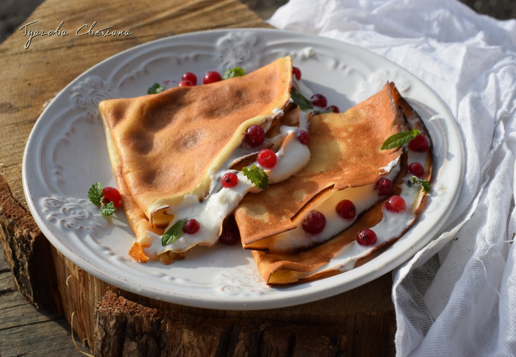 Украшаем наши блины с рикоттой ягодами и подаем к чаю или кофе.