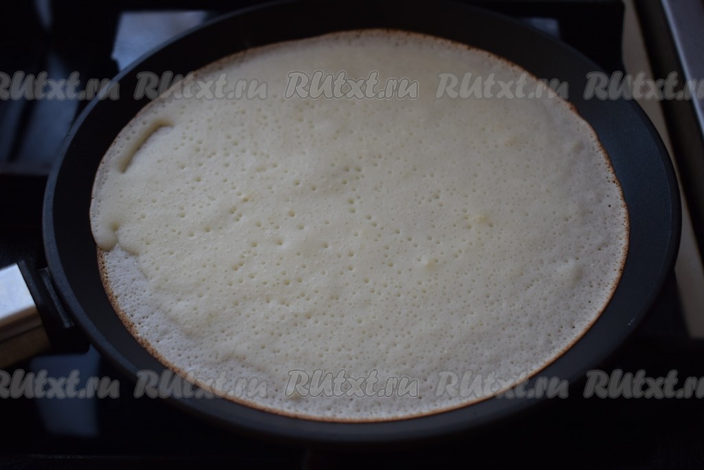 Печем блины на среднем огне по 2-3 минуты (до румяности) с каждой стороны.