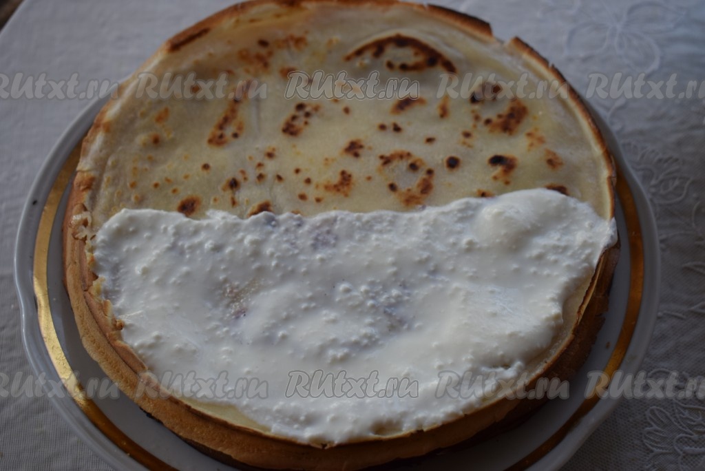 Когда блины остынут и станут теплыми, можно смазать их начинкой.