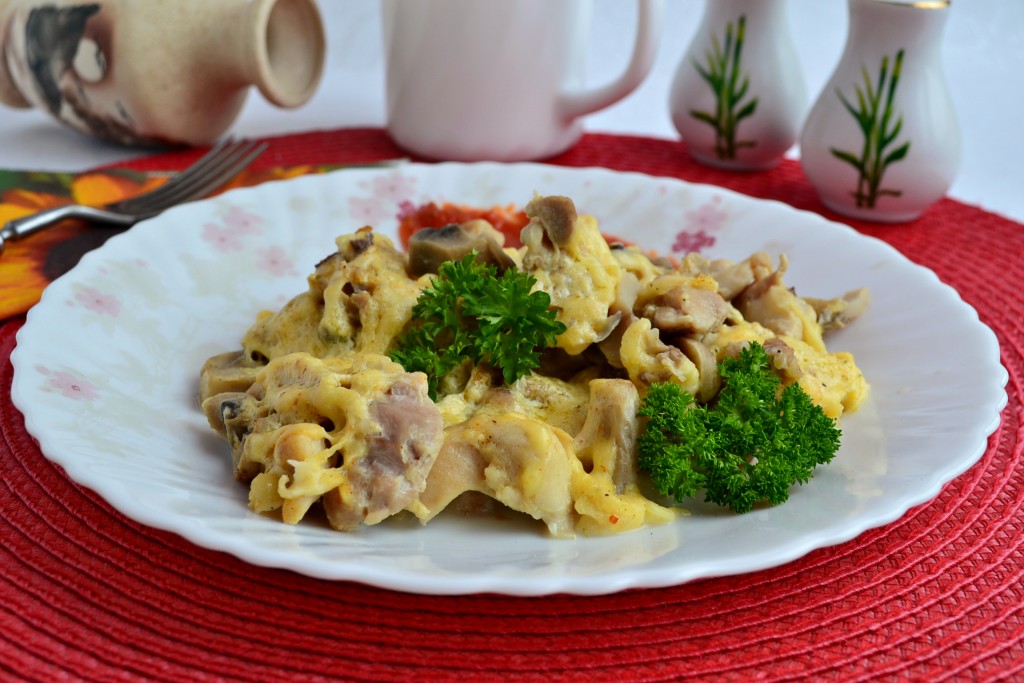 Очень вкусный и нежный жульен с курицей и грибами, приготовленный в микроволновке, к столу подаём в горячем виде.