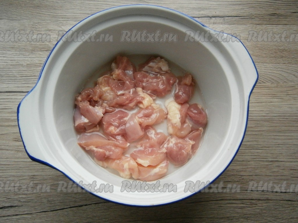 Куриное мясо нарезать кусочками и поместить в подходящую для СВЧ глубокую кастрюльку, влить воду. Кастрюльку накрыть крышкой и поместить в микроволновку на 3 минуты при мощности 750 Ватт.