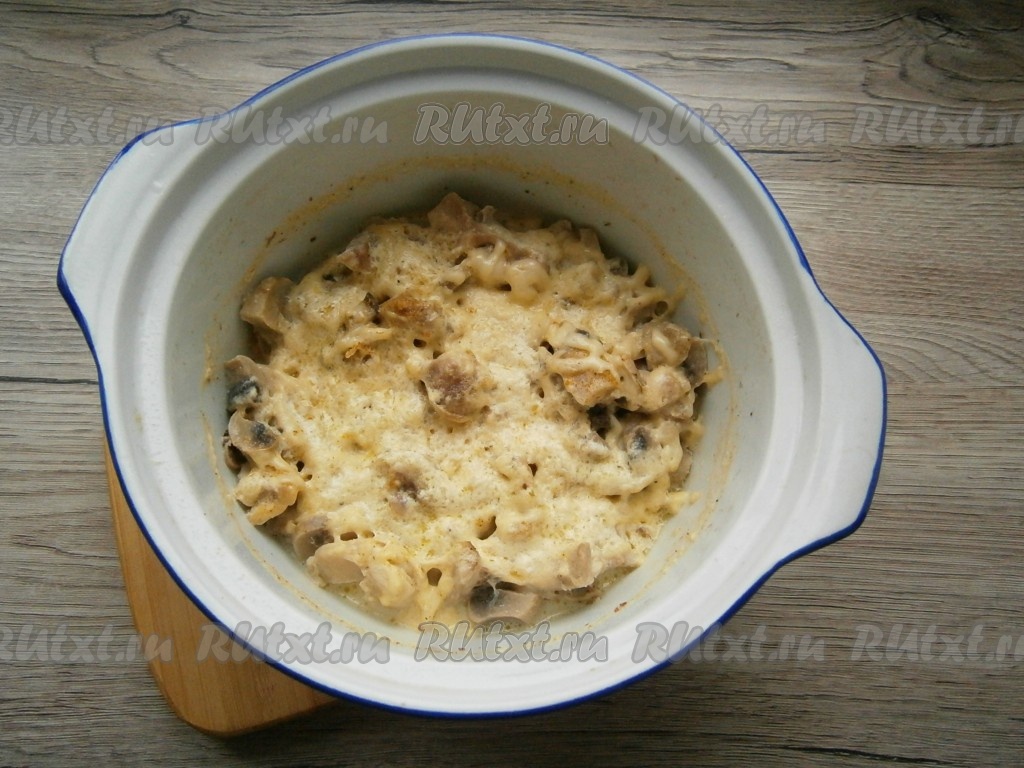 Курицу с грибами посолить, посыпать специями, влить сливки и посыпать все натертым сыром. Поместить блюдо в микроволновку еще на 3-4 минуты при мощности 750 Ватт.