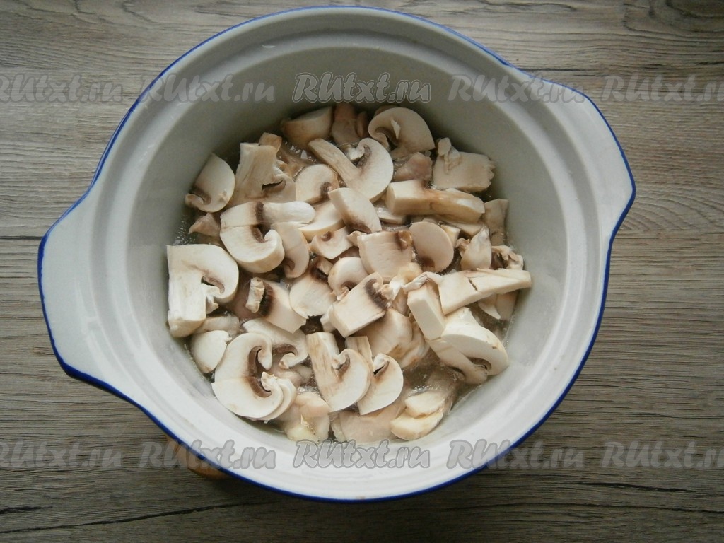 Далее к курице добавить нарезанные пластинами шампиньоны и отправить снова в СВЧ на 3 минуты при той же мощности.