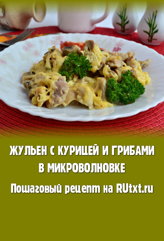 Жульен - вкусное и нежное блюдо французской кухни. Предлагаю вам приготовить замечательный жульен с курицей и грибами в микроволновке. Для приготовления этого блюда вам потребуется всего 10 минут. Жульен получается необычайно нежным, вкусным и ароматным. Это прекрасное блюдо можно подать на завтрак или ужин, дополнив легким овощным салатом.