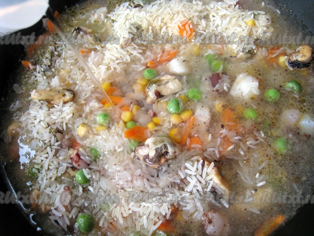 Затем высыпать промытый рис, специи, травы и залить водой в количестве на 1,5 - 2 см выше уровня риса с овощами и морепродуктами.