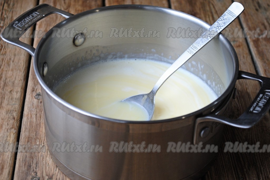 Снять кастрюлю с огня и, непрерывно помешивая, в горячее молоко постепенно добавить молочно-пудинговую смесь, тщательно перемешивая.