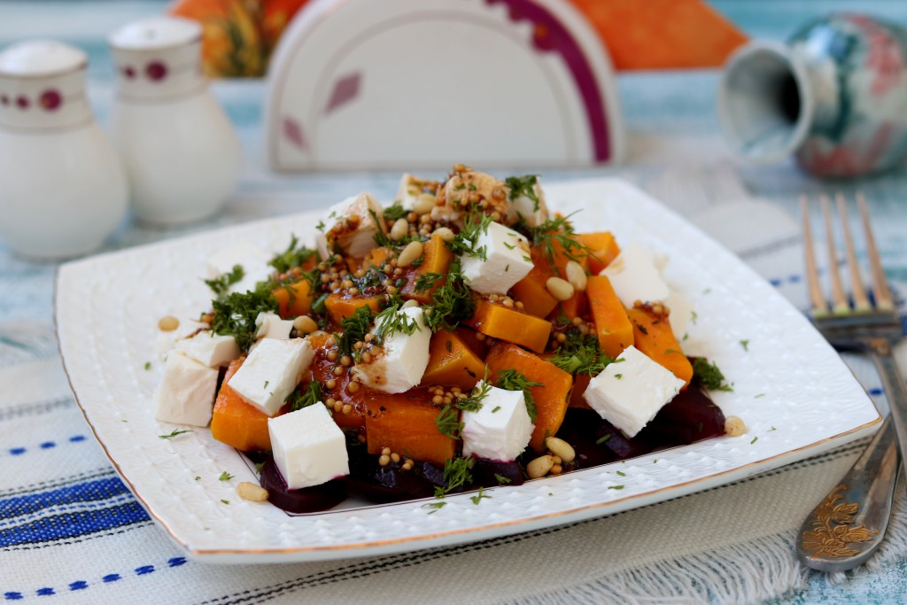 Салат из запеченной тыквы и сыра фета получается не только вкусным, но и полезным. Пикантную нотку блюду придаёт горчичная заправка. Конечно, с ингредиентами можно экспериментировать, обогащая вкус салата и другими запеченными овощами. Я решила дополнить блюдо запеченной свеклой, салатик получился ещё более вкусным. Этот полезный салат понравится многим, попробуйте!