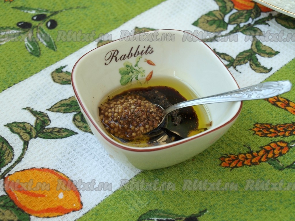 Для приготовления заправки смешать столовую ложку оливкового масла, горчицу, винный (или бальзамический) уксус, перец и соль, перемешать.
